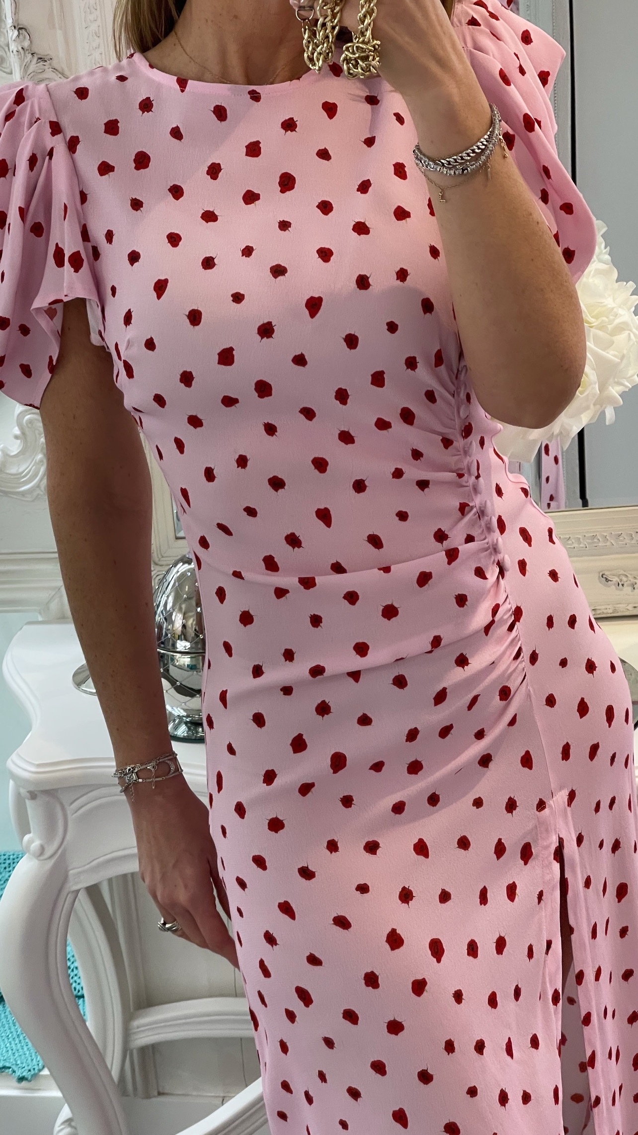 Un abito rosa delicato impreziosito da piccole rose rosse, che donano un tocco vivace e romantico.