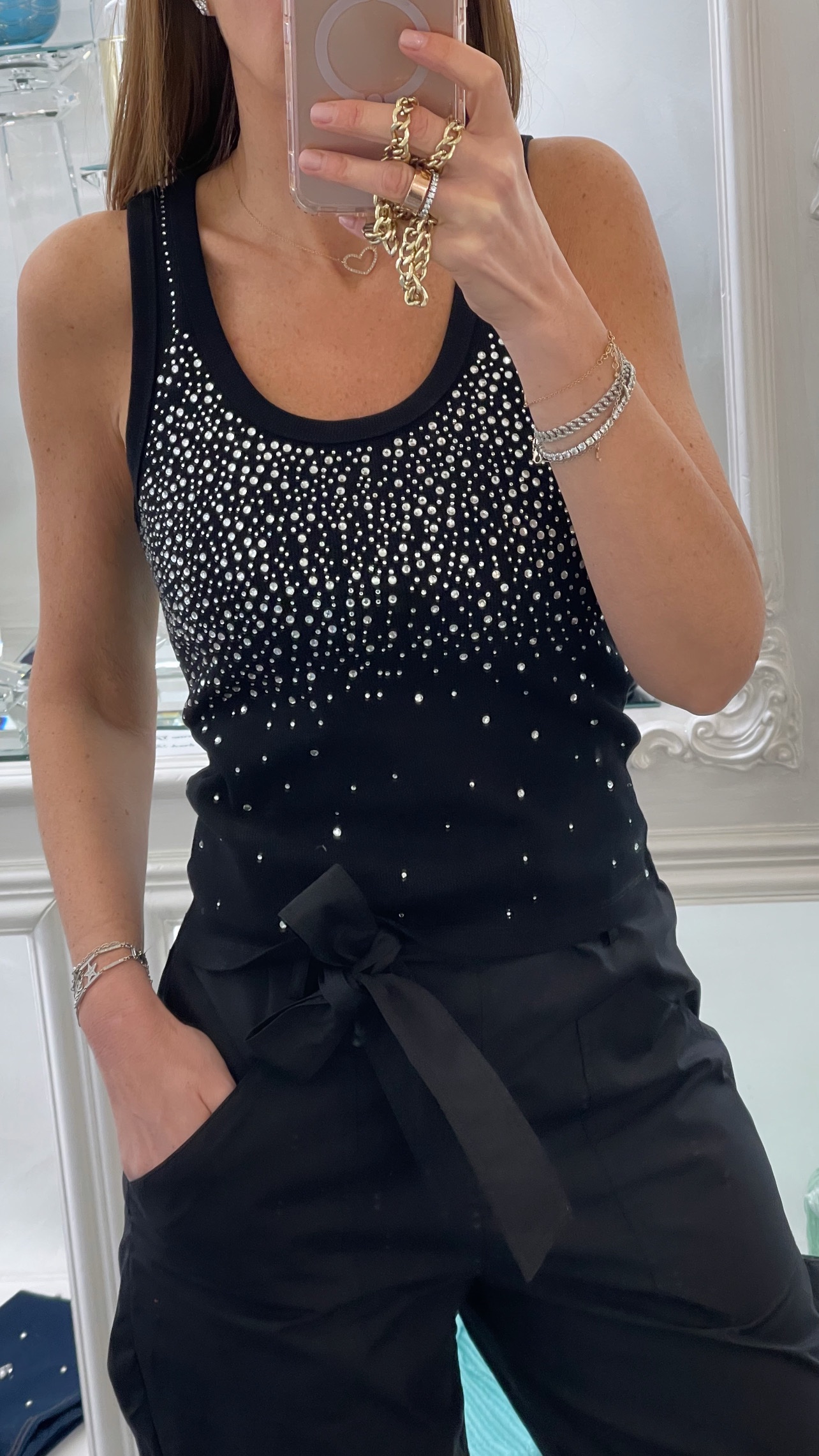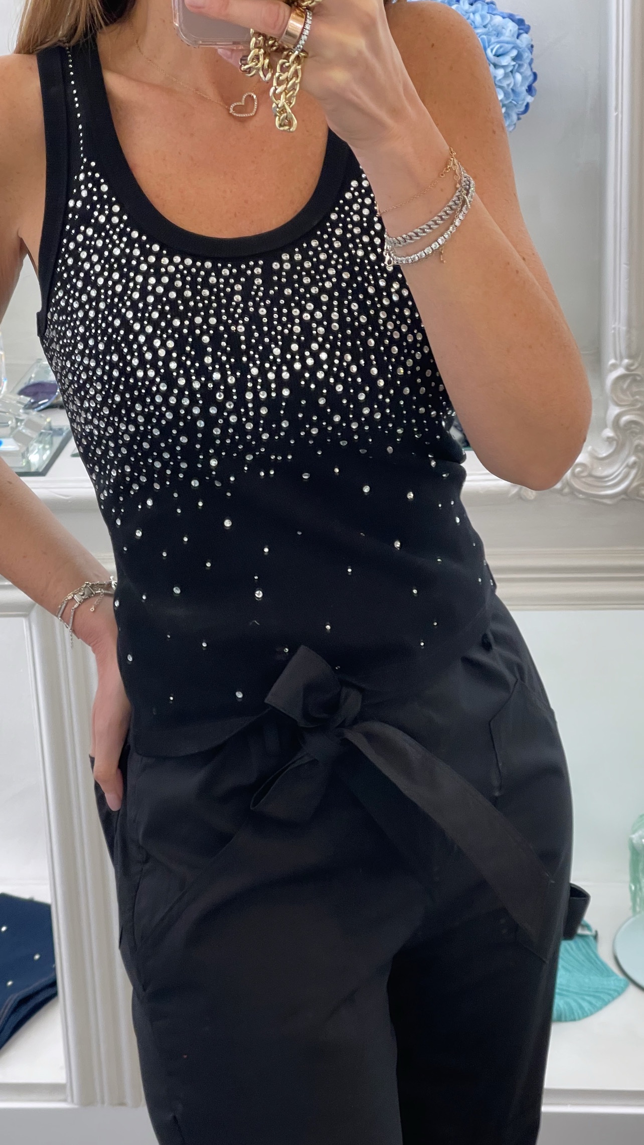 Una canotta dal carattere luminoso e sofisticato, pensata per valorizzare la figura con un tocco di glamour discreto ma irresistibile.