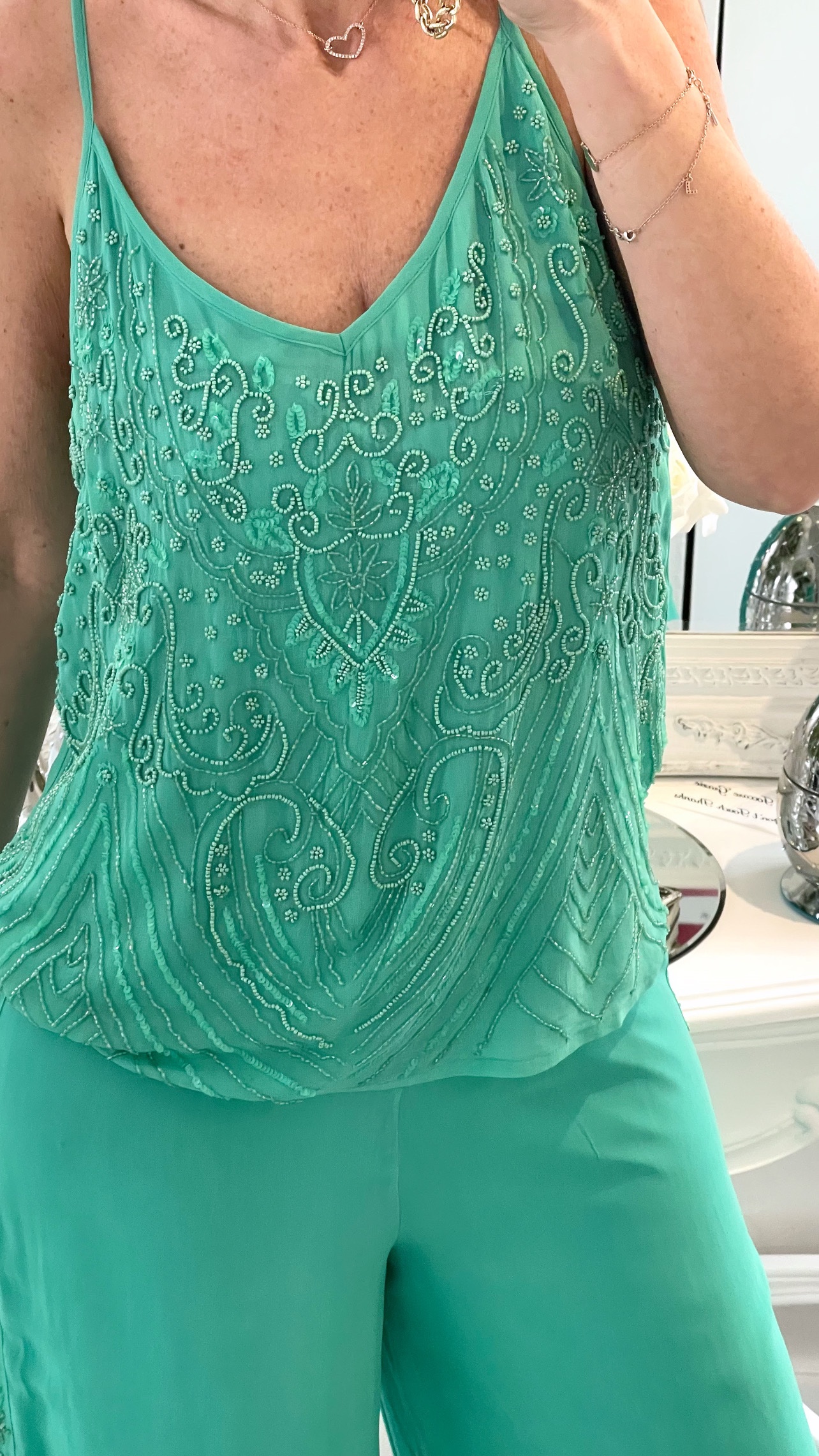 Canotta interamente ricamata con perline e micro‑paillettes tono su tono.