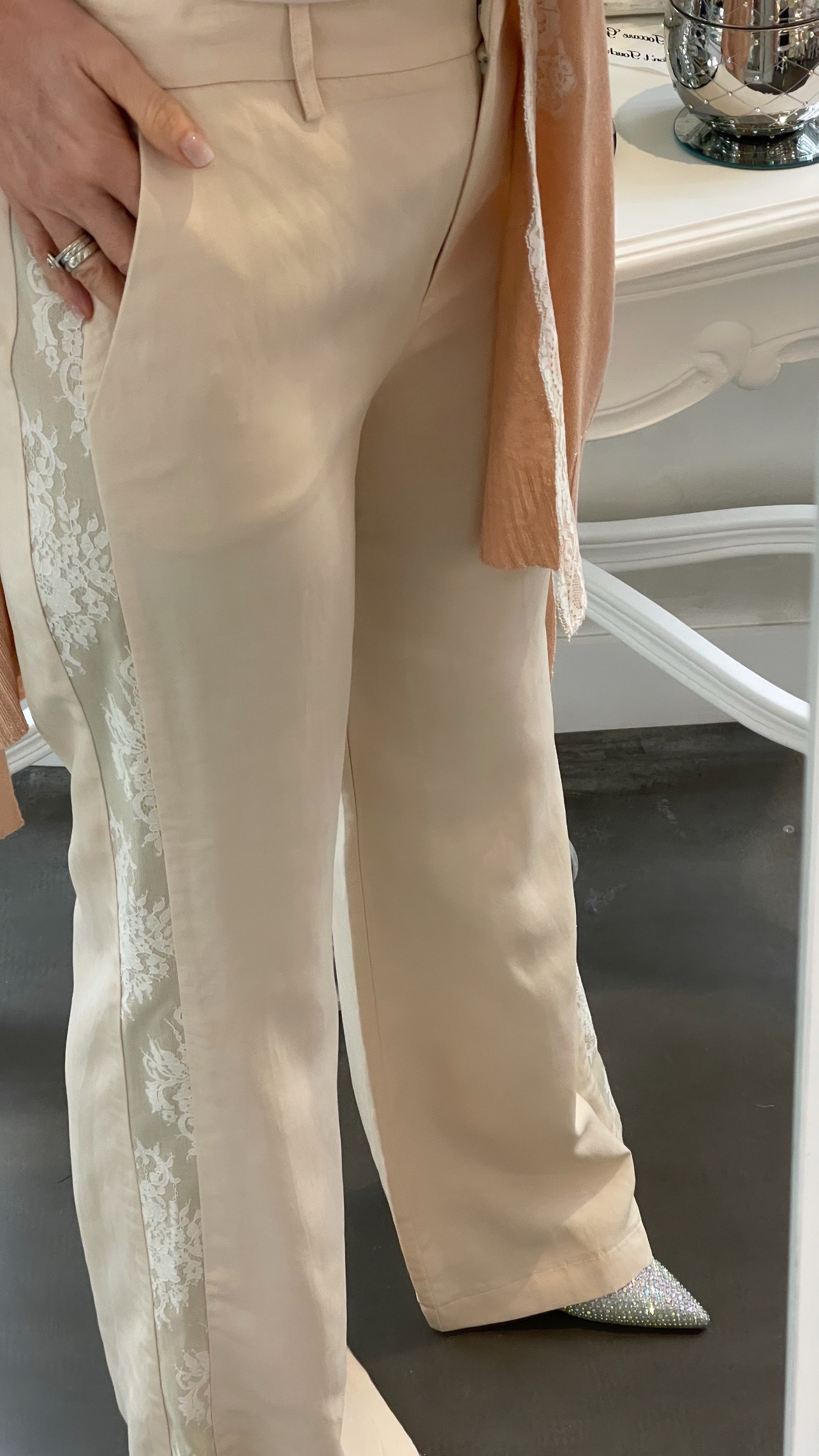 Il dettaglio in pizzo che corre lungo il fianco aggiunge un tocco ricercato, creando un contrasto raffinato tra la fluidità del tessuto e la delicatezza della lavorazione.