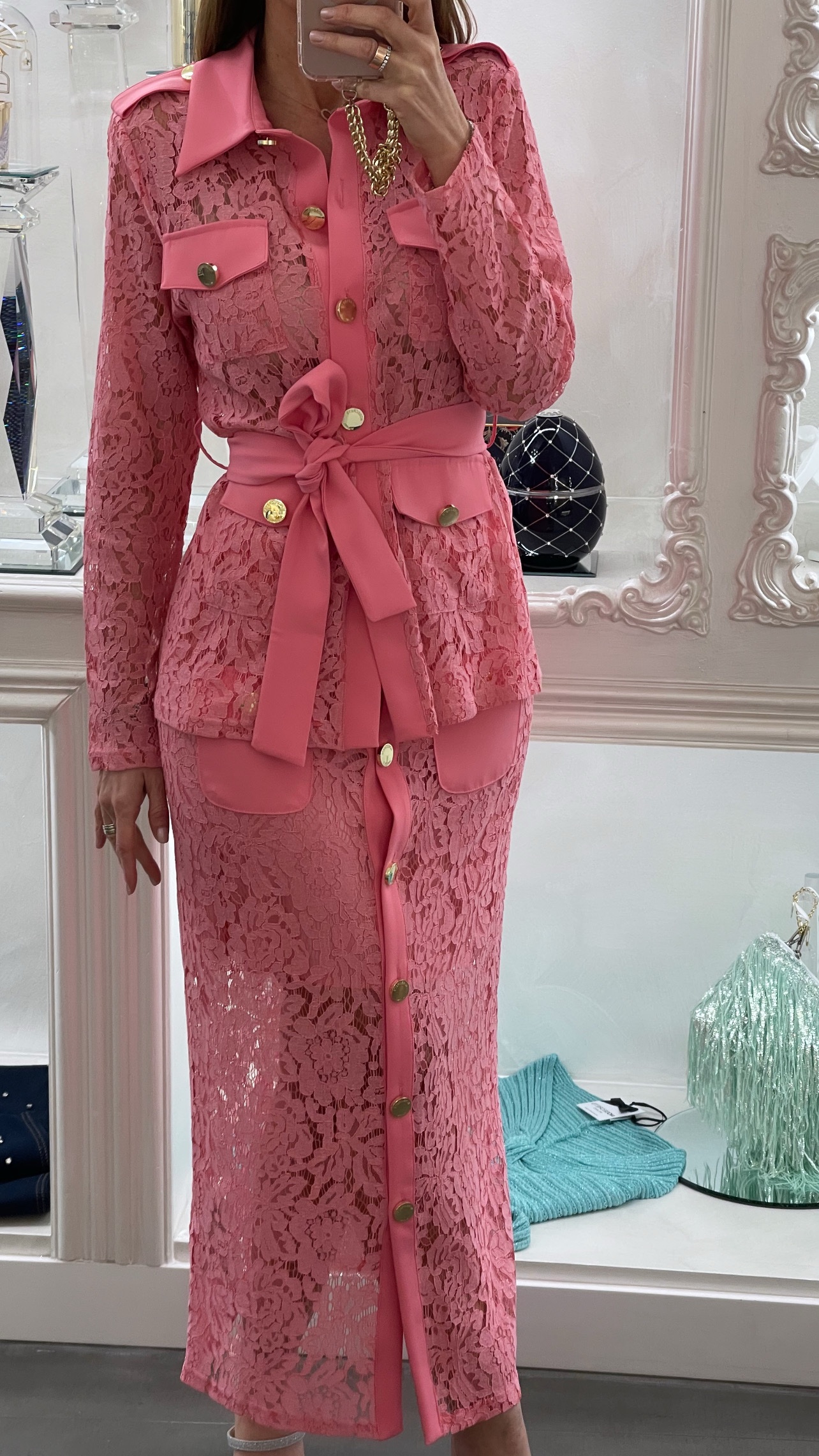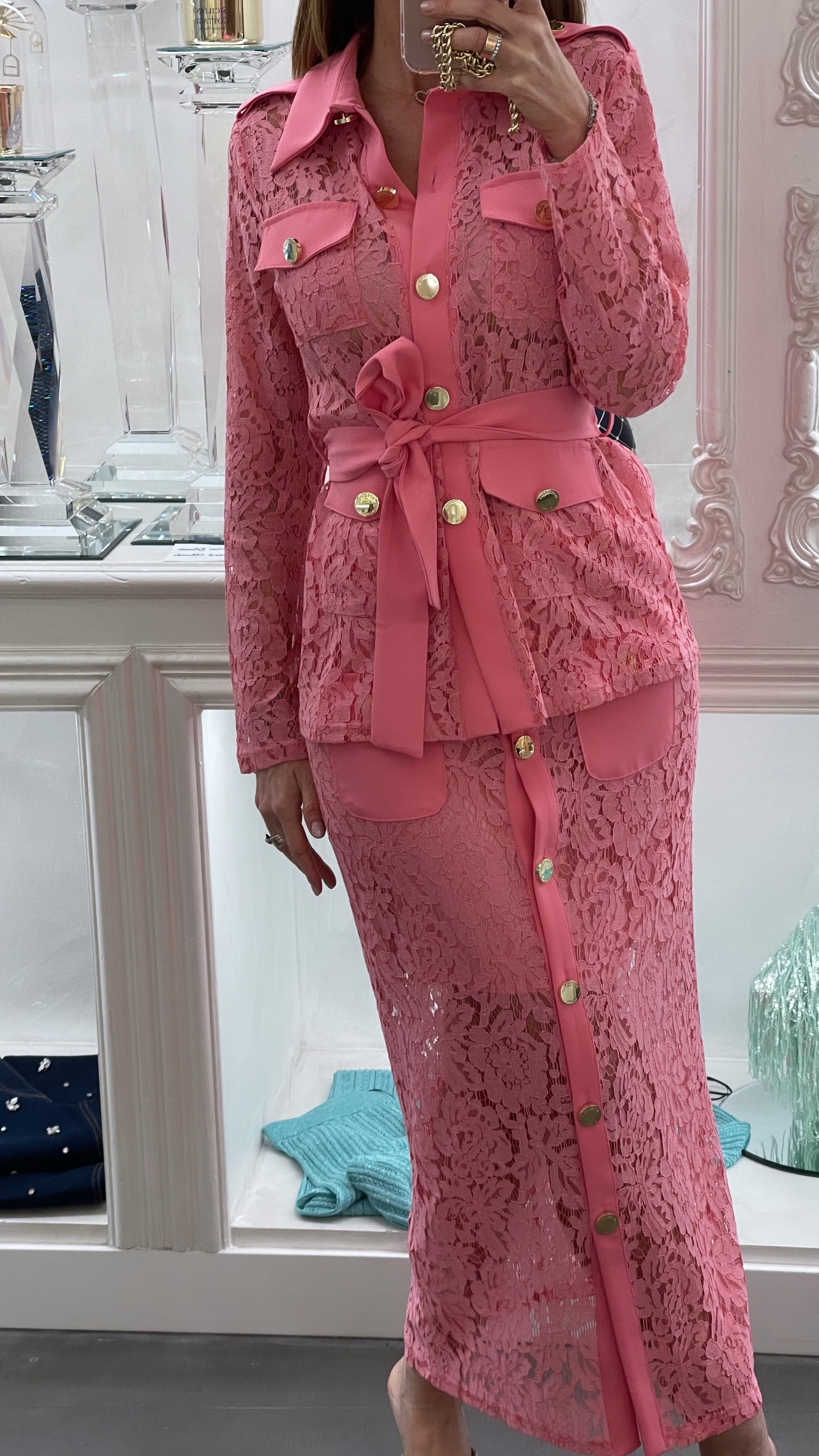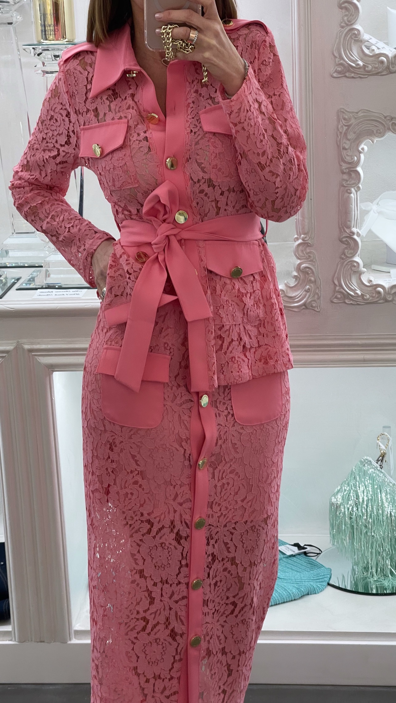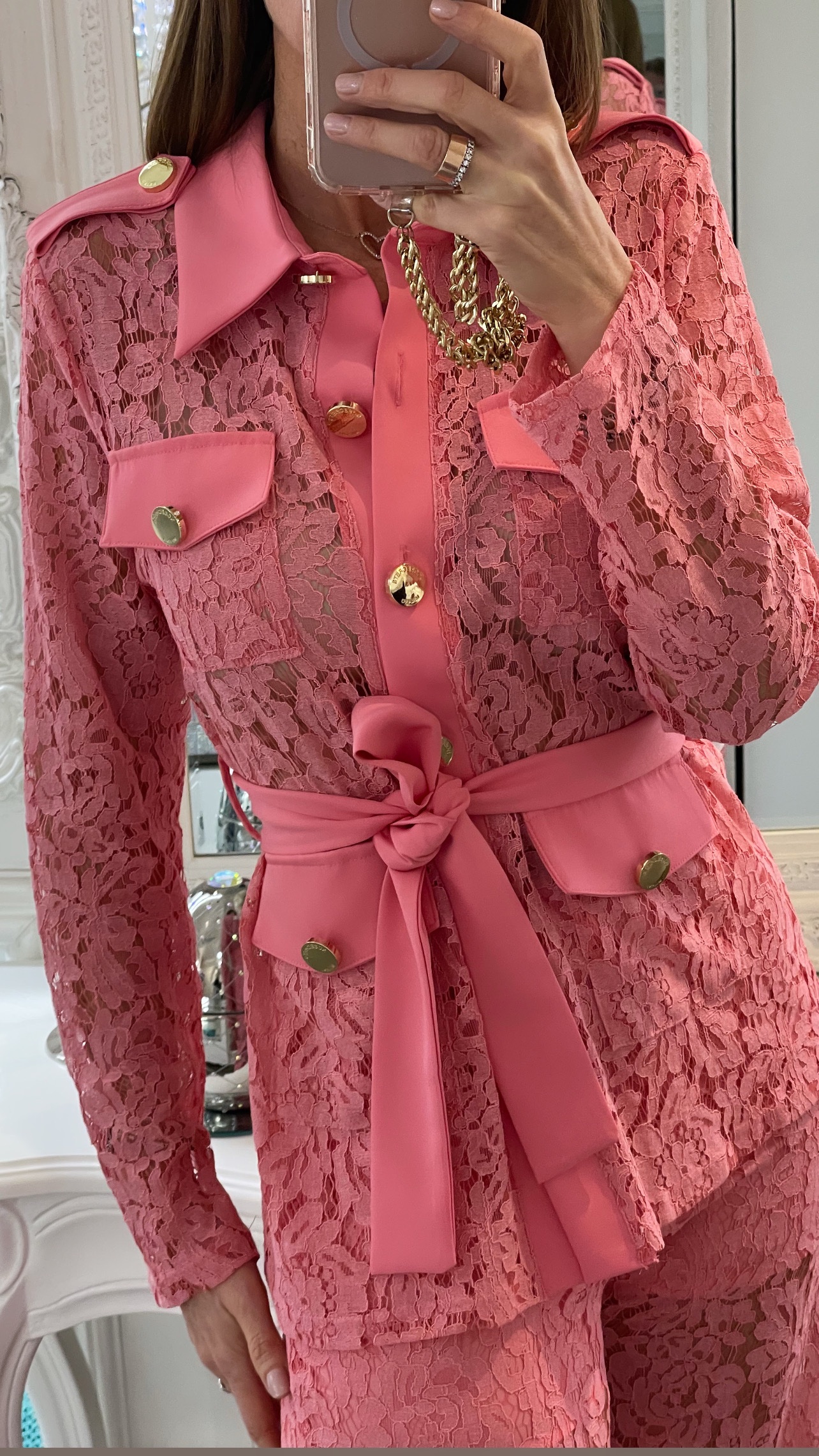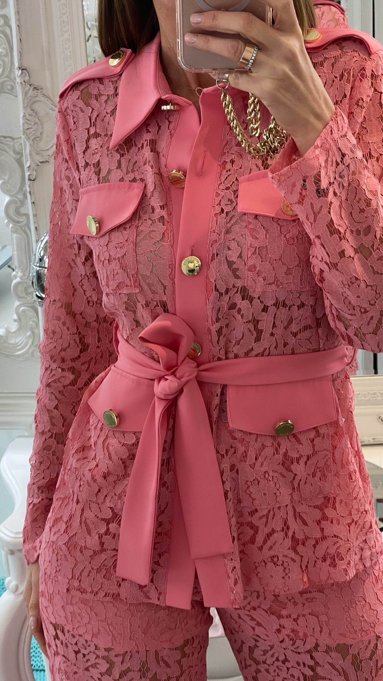 Sahariana in pizzo rosa dalla linea strutturata e femminile, definita da un motivo floreale che dona leggerezza e ricercatezza.