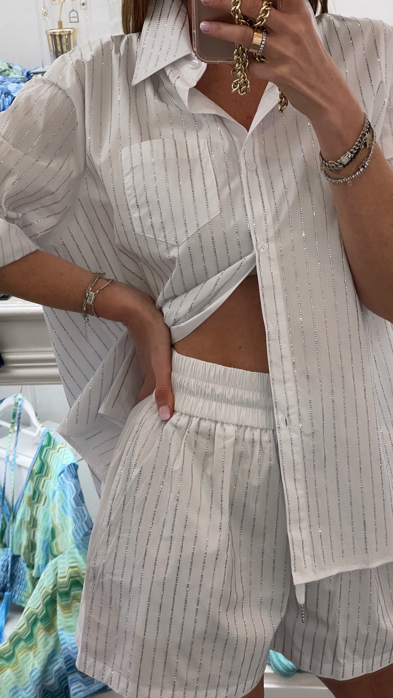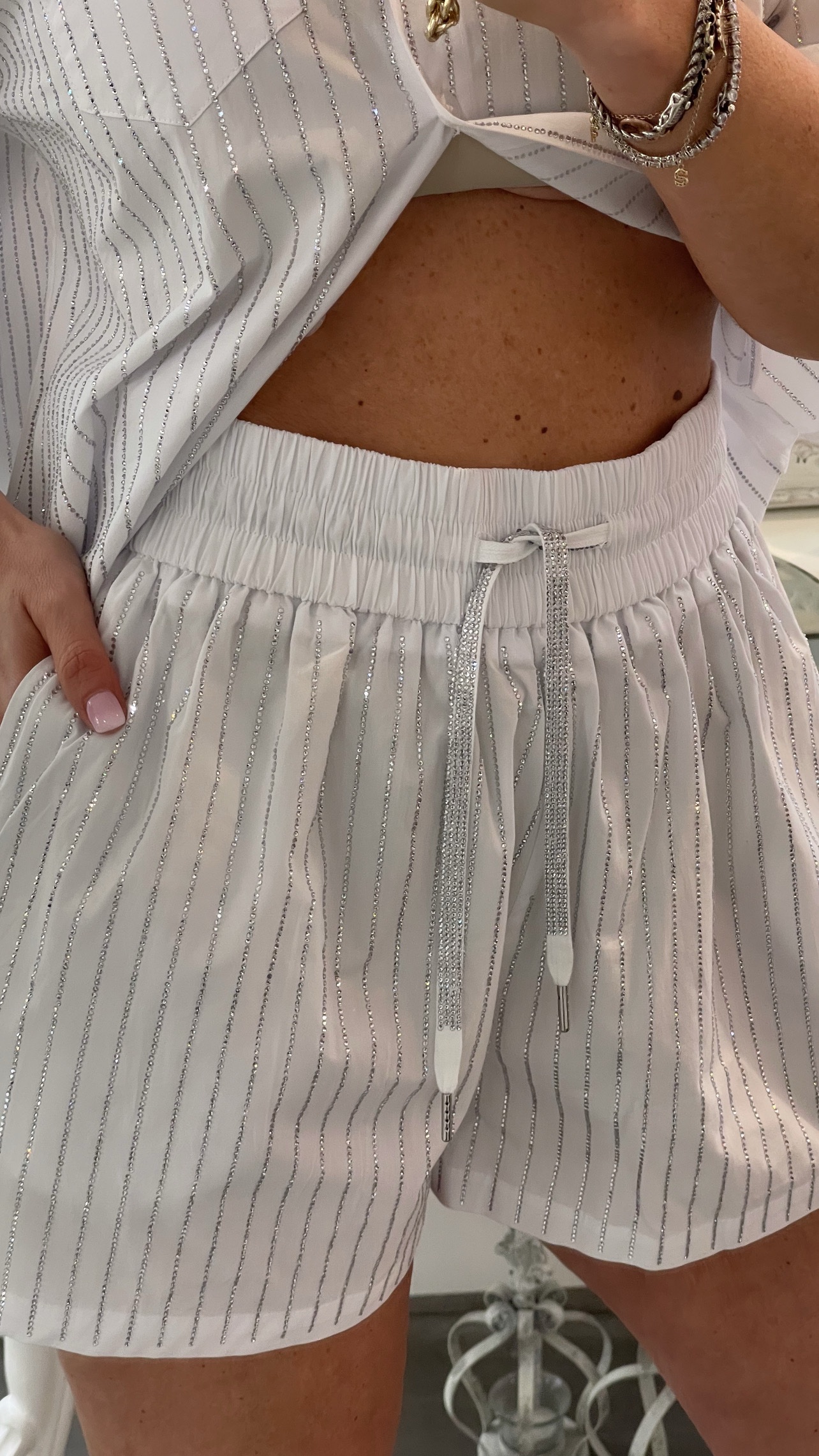 Shorts a vita alta in filato leggero dalla texture rigata da cristalli applicati in modello gessato, pensati per offrire comfort e femminilità nelle giornate più calde.